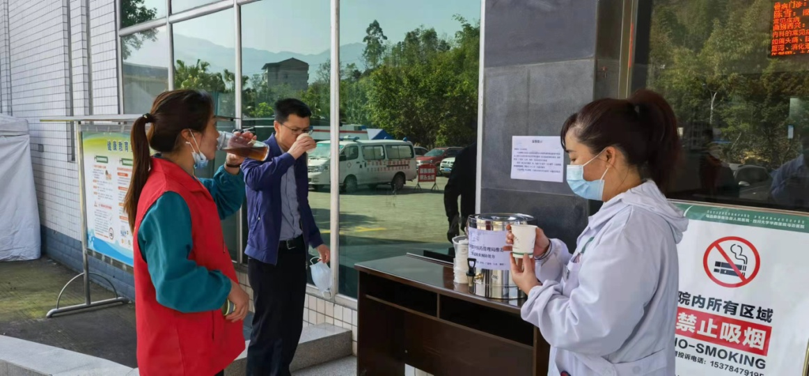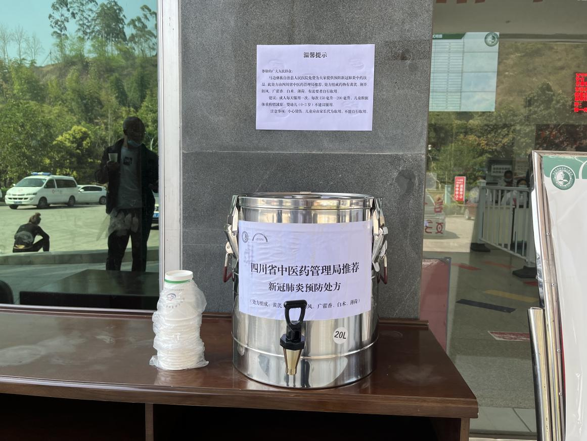 为充分发挥中医中药在新冠肺炎疫情防控中的积极作用,2022年3月18日起医院专门购置不锈钢容器用以存放预防新冠肺炎的中药汤剂,并在县人民医院本部院区与光明院区门诊大厅入口设置免费饮用点,供医务人员、就诊人员、住院患者及家属饮用,改变既往只给特殊岗位人群提供中药汤剂的服务模式。