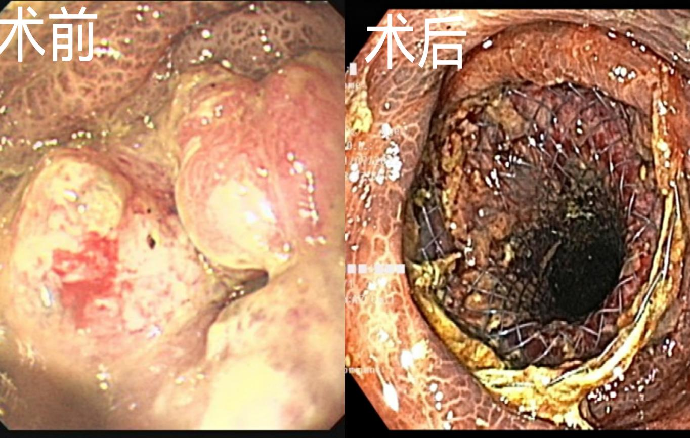 在清洁灌肠后为患者进行普通肠镜检查,发现管腔狭窄,再次与患者家属沟通后为患者行直肠支架置入术,支架释放后见大量粪便排出,手术顺利,患者术中及术后平稳,送回内二科接受下一步治疗。