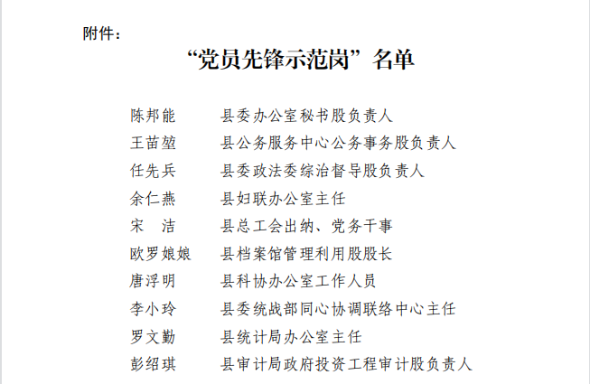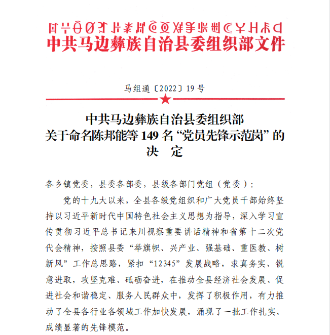 县委组织部为树立标杆、鼓舞斗志,充分发挥共产党员的先锋模范作用,形成“比、学、赶、超”良好氛围,推动“展旗”行动走深走实,公布了《中共马边彝族自治县委组织部关于命名陈邦能等149名“党员先锋示范岗”的决定》文件,其中县人民医院刘凡林、陈淑怡两位同志荣获“党员先锋示范岗”荣誉称号。