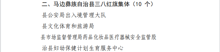县妇联为表彰先进,树立榜样,用不负韶华的担当奉献彰显新时代新征程新女性风采,公布了《马边彝族自治县妇女联合会关于表扬2021年度三八红旗手(集体)和妇女工作先进个人(集体)评选表扬活动名单》,授予县级三八红旗手32名、三八红旗集体10个、妇女先进个人28人、妇女工作先进集体11个荣誉称号。县人民医院麻醉科荣获2021年度县级“三八红旗集体”、曲别曲巫同志荣获县“三八红旗手”荣誉称号。